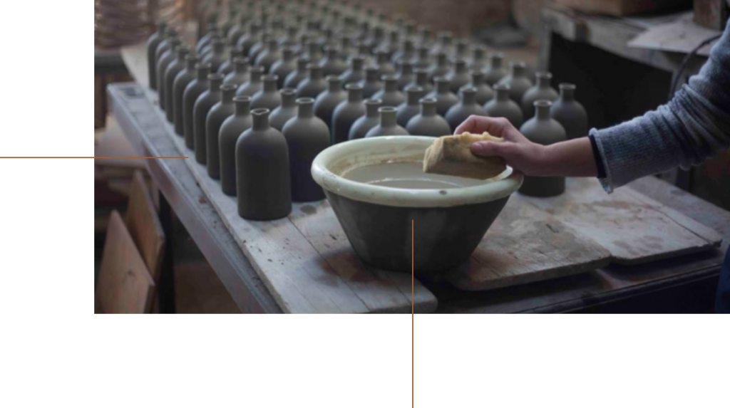 Dopo la prima cottura si passa alla smaltatura per immersione o a spruzzo, con smalti, engobbi. Questa fase produttiva consente di poter decorare o graffire l’oggetto o, semplicemente, donargli un colore uniforme. L’uso di smalti apiombici certificati consente l’utilizzo della ceramica per la somministrazione di bevande e alimenti.