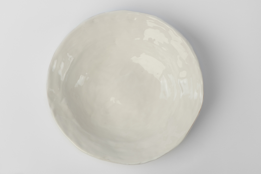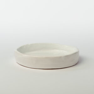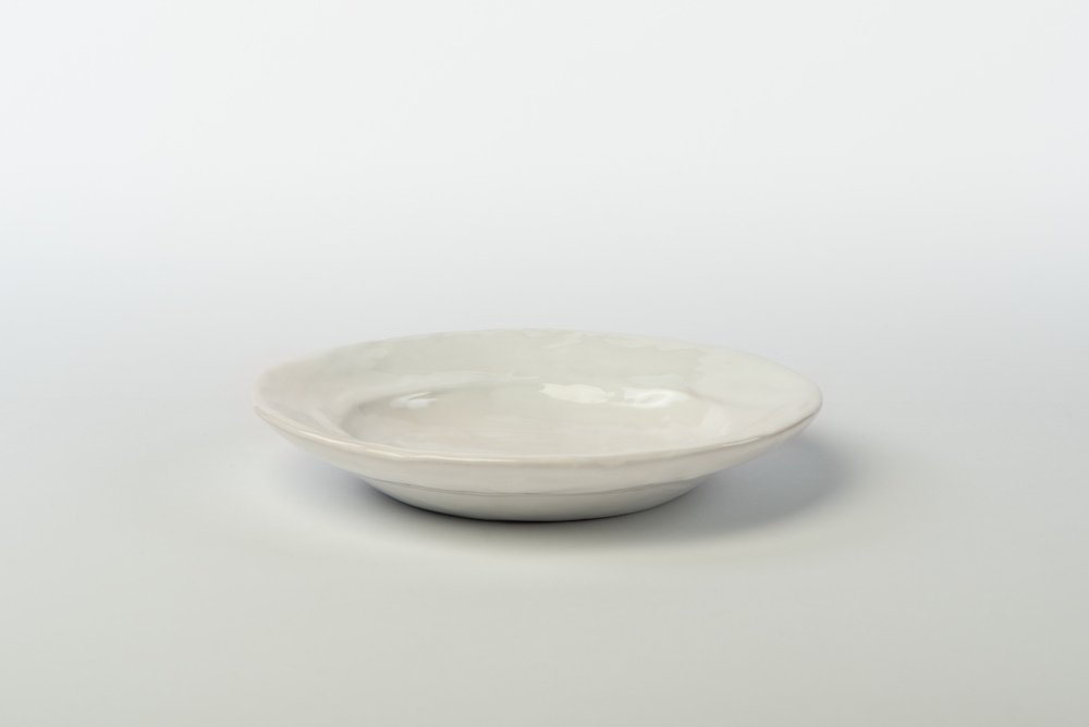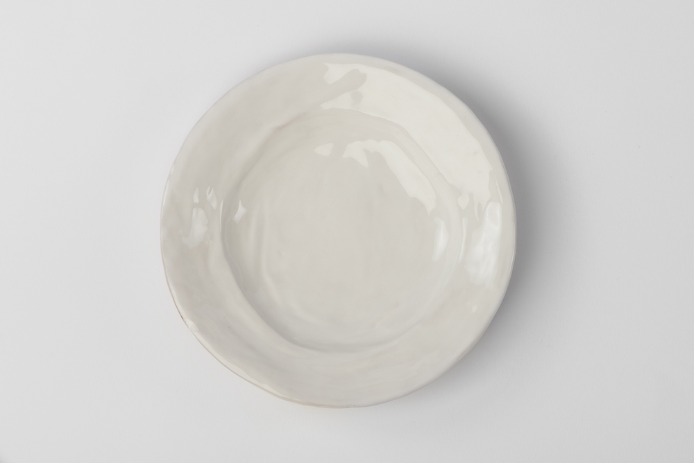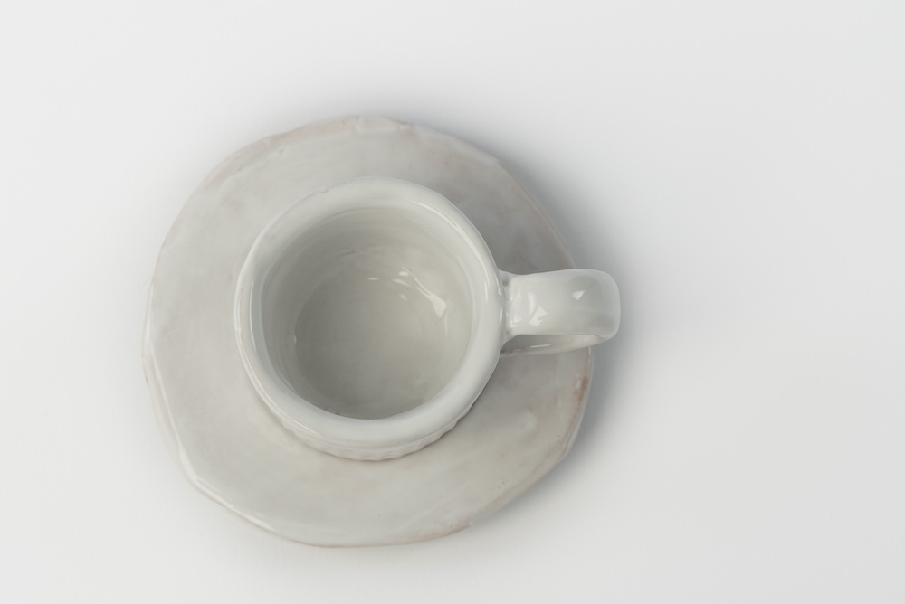 Tazzine da caffè con piattino tondo irregolare, modellate a mano, smalto bianco